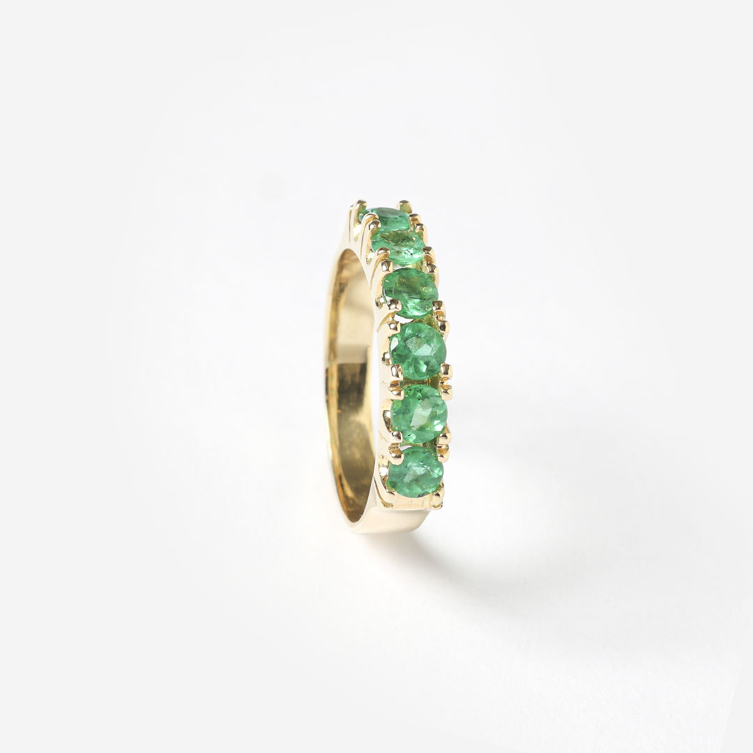 Meia Aliança ouro amarelo 18K com esmeraldas. Metal: Ouro amarelo 18K. Pedras: Esmeraldas